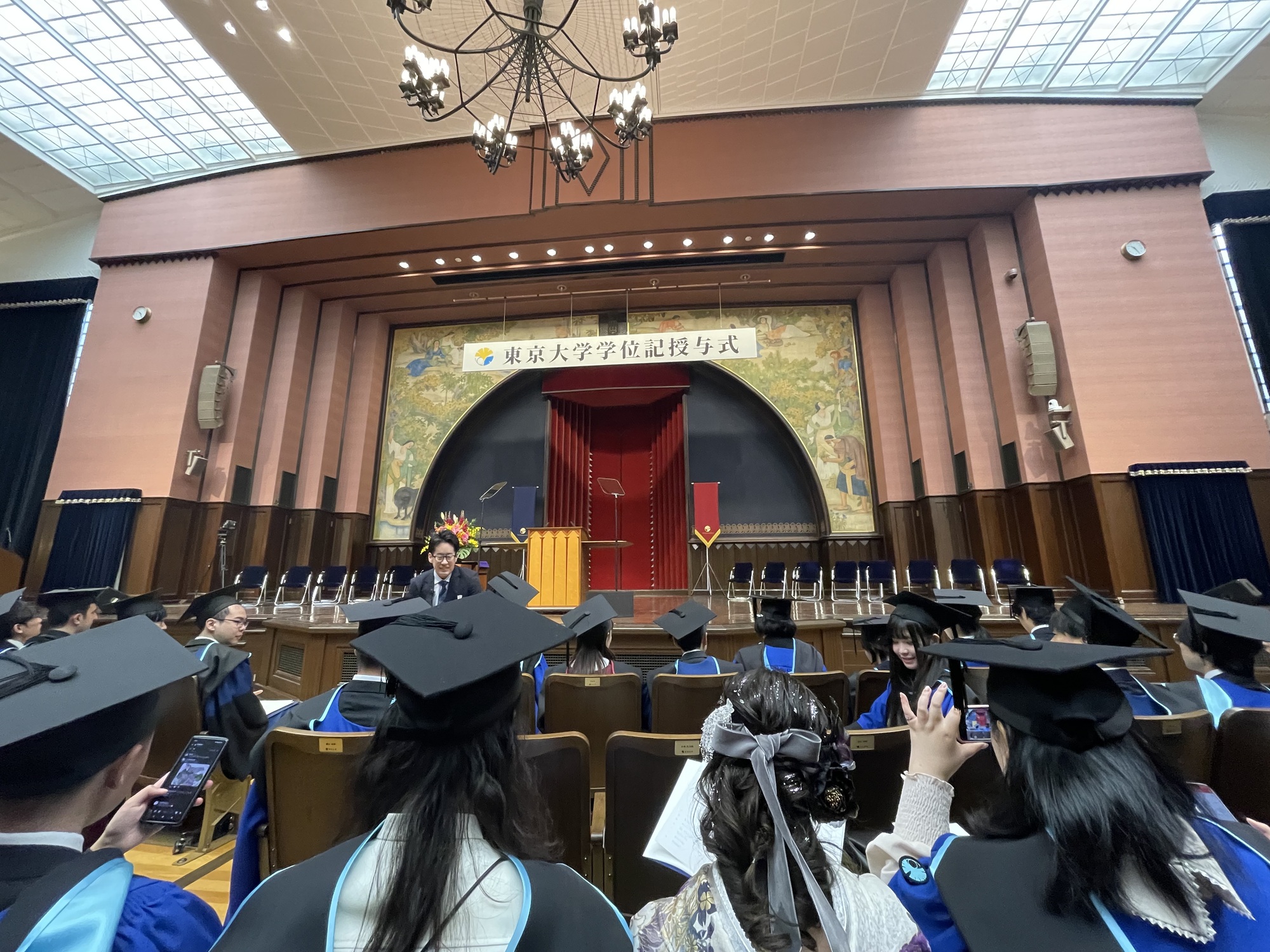 On March 24, 2025, we had our graduation ceremony in the morning at the Hongo Campus, followed by the completion ceremony for our department—Department of Ocean Technology, Policy, and Environment—in the afternoon at the Kashiwa Campus.